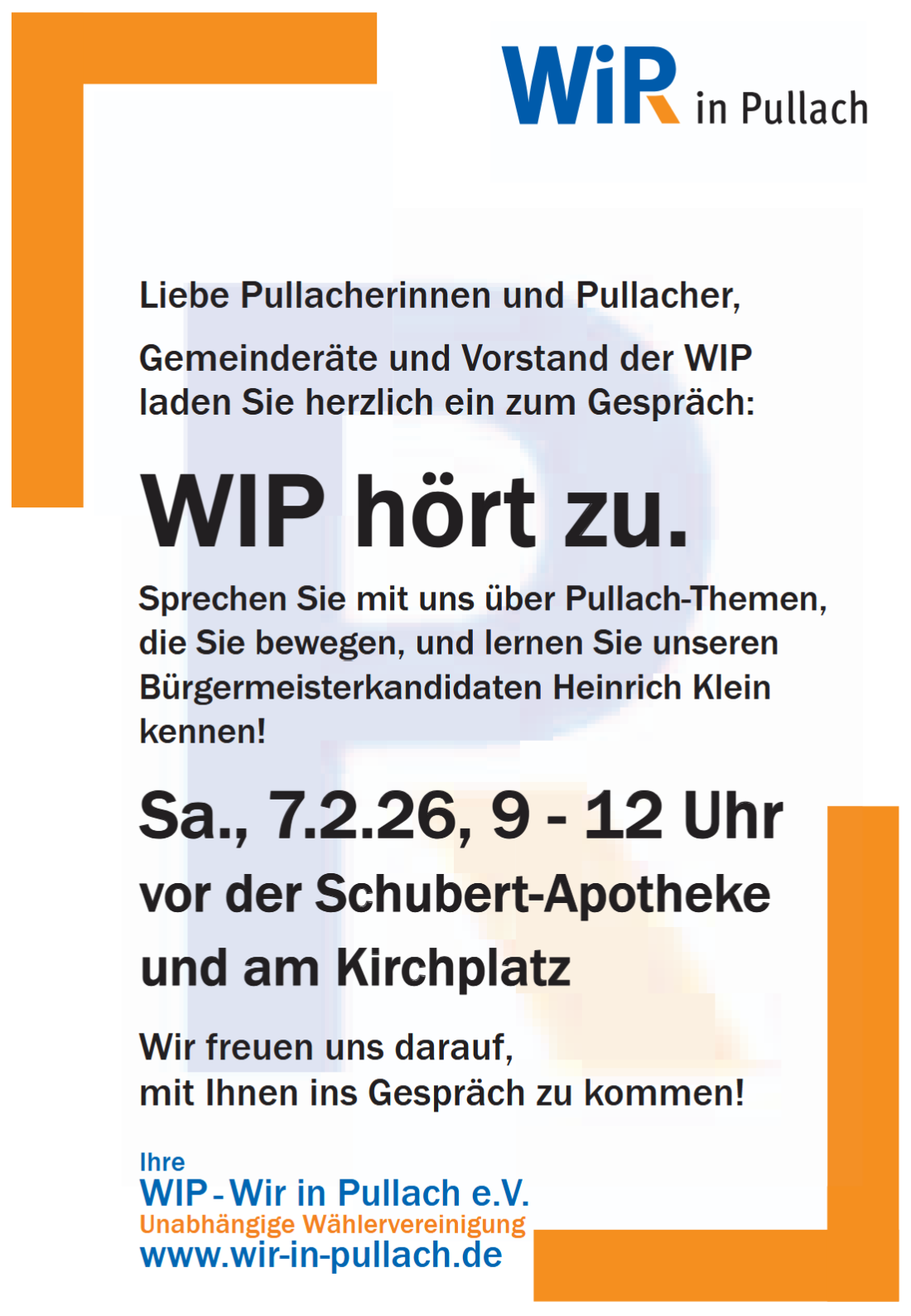 Ich freue mich sehr auf die kommenden Wochen: auf Gespräche, Begegnungen und den Austausch mit Ihnen. Als überparteilicher und parteiloser Bürgermeisterkandidat, nominiert von der WIP, ist mir dieser Dialog besonders wichtig. Gemeinsam können wir darüber sprechen, wie Pullach auch künftig lebenswert, sicher und gut aufgestellt bleibt.