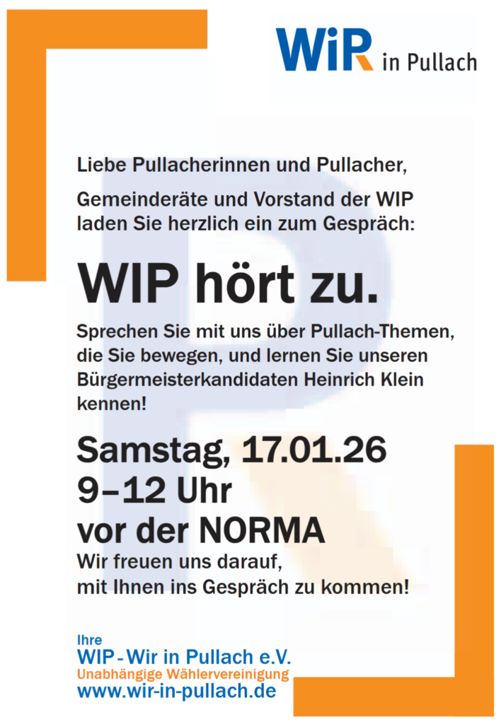Die unabhängige Bürgervereinigung Wir in Pullach – WiP lädt alle Seniorinnen und Senioren herzlich zum gemeinsamen Mittagstisch ein.
